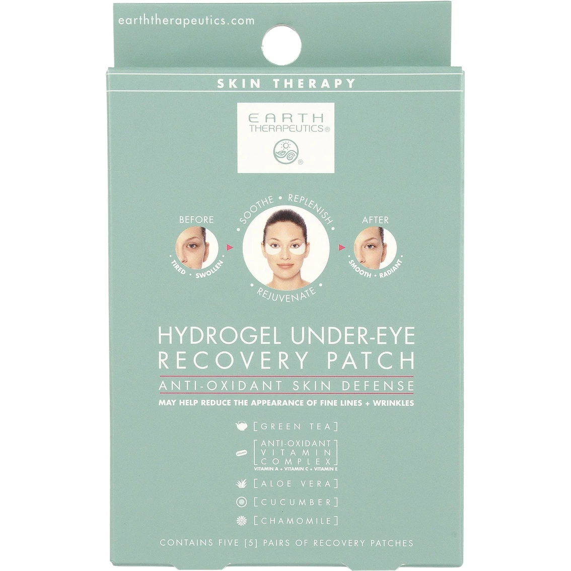 The revolutionary, one-step disposable eye treatment from Earth Therapeutics RX. These unique treatment strips adhere to the face to soothe and rejuvenate delicate skin under the eyes. Enriched with a beneficial blend of plant extracts, green tea and anti-oxidant vitamins, the gel sheet is actually an Active Hydrogel Matrix that cools and comforts on contact while delivering a continuous, concentrated flow of nourishment and hydration to the skin. Puffiness and swelling are relieved; dark circles are diminished. Used regularly over time, the Under-Eye Patches may even help to visibly reduce the appearance of fine lines and wrinkles. Each pack contains 5 pairs of patches (total of 10 patches).