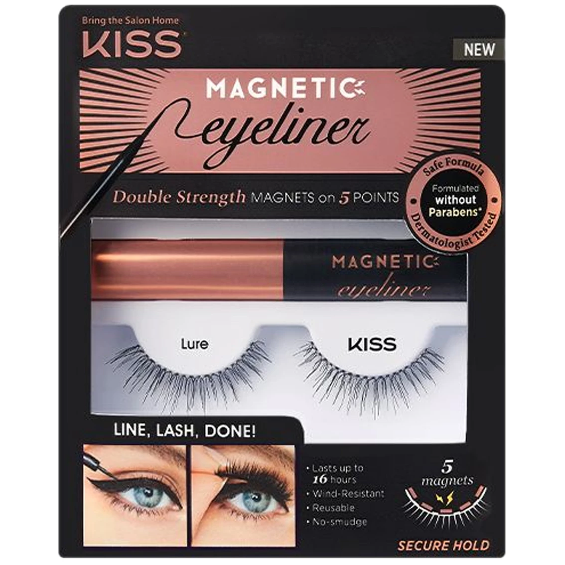 Prepare to change the way you Lash with the KISS Magnetic Eyeliner and Lash Kit! Like magic, the lashes cling to the liner like glue (but there’s no glue needed). Kit contains: KISS Magnetic Eyeliner (0.16 oz) and reusable lashes. Line, lash, done. Wind-resistant, reusable lashes, dermatologist tested. Formulated without prostaglandin, silicone, synthetic fragrances and dyes, parabens, petrochemicals, GMOs, and formaldehyde. Model: KMEK01.