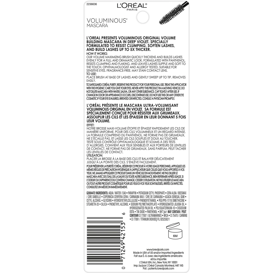 L’Oreal Paris Voluminous Original Volume Building Mascara is uniquely formulated to resist clumping, keep lashes soft, and build lashes up to 5x their natural thickness. Volume Maximizing Brush quickly thickens and builds lashes evenly for a full and bold look. Contains Panthenol and Ceramide-R and helps protect and condition lashes. Resists clumping and flaking, and leaves lashes supple and soft to the touch.