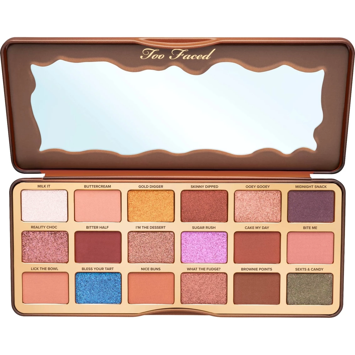 Indulge in the Too Faced Better Than Chocolate Cocoa-Infused Eye Shadow Palette that is so deliciously exotic, buttery rich and stylishly seductive it’ll have you falling in love at first bite! This cocoa powder-infused palette features 18 ultra-creamy, rich and chocolaty shades and pops of deliciously bold candy color. Velvety mattes, sugary shimmers and melted metallics all work together in countless combinations to create the most naturally decadent looks youโve ever experienced.